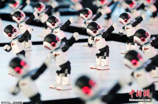 資料圖:當(dāng)?shù)貢r(shí)間2015年1月19日,日本東京,DIY機(jī)械展覽上100機(jī)器人大跳“廣場(chǎng)舞”,這批智能機(jī)器人高約34.5厘米,還能識(shí)別200個(gè)日文短語,走路、踢球更是不在話下。