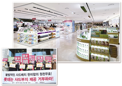 左圖 2月27日,韓國民眾在位于首爾的樂天集團總部前舉行抗議示威活動,并高舉反對樂天出讓“薩德”用地的標(biāo)語。 新華社發(fā)