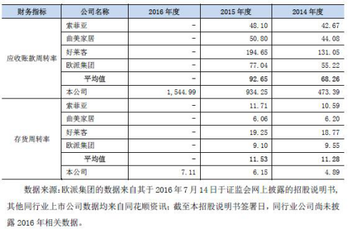 2014至2016應(yīng)收賬款周轉(zhuǎn)率及存貨周轉(zhuǎn)率與同行業(yè)公司對(duì)比(來(lái)源:招股書(shū))