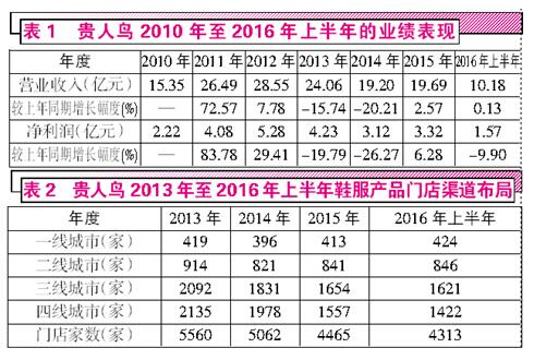 貴人鳥起家于傳統(tǒng)運動鞋服生產業(yè)務,在2014年上市之后,門店數(shù)量開始出現(xiàn)大規(guī)模萎縮。2013年至2016年上半年的財報顯示,貴人鳥在國內布局的門店家數(shù)一路下滑,已經(jīng)由2013年時的5560家下滑至2016年上半年的4313家。