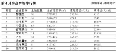 中國指數(shù)研究院的統(tǒng)計顯示,前4月從拿地金額來看,碧桂園和保利繼續(xù)穩(wěn)居前兩位,首開、遠洋晉級TOP10。另據(jù)中原地產(chǎn)的數(shù)據(jù)顯示,今年前4月,拿地超過百億的房企合計18家。