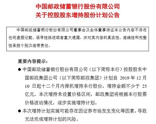 備受市場關(guān)注的是,同日,郵儲銀行還發(fā)布了《關(guān)于控股股東增持股份計劃公告》。公告稱,控股股東中國郵政集團公司(下稱郵政集團)計劃自2019年12月10日起12個月內(nèi)擇機增持該行A股股份,增持金額不少于25億元。這體現(xiàn)了控股股東對郵儲銀行投資價值的高度認(rèn)可,也將為證券市場的穩(wěn)定運行創(chuàng)造良好環(huán)境,彰顯“國家隊”擔(dān)當(dāng)。