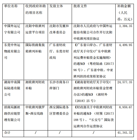 其中,中國外運(yùn)在2019年7月-9月期間獲得的超過500萬元人民幣的大額政府補(bǔ)貼項(xiàng)目有:沈陽中歐班列運(yùn)營平臺項(xiàng)目獲得補(bǔ)助金額3304.35萬元、國際鐵路集裝箱班列補(bǔ)貼獲得補(bǔ)助金額4499.95萬元、湘歐班列財(cái)政補(bǔ)貼獲得補(bǔ)助金額2.46億元、中歐班列俄羅斯-西安線路獲得補(bǔ)助金額8959.67萬元。