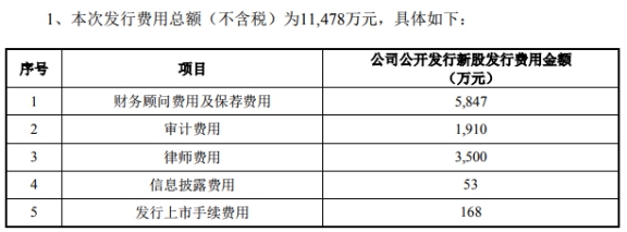 本次發(fā)行費(fèi)用(不含稅)共計(jì)1.15億元,其中中信證券、招商證券作為保薦機(jī)構(gòu)獲得保薦、承銷費(fèi)用5847萬元。