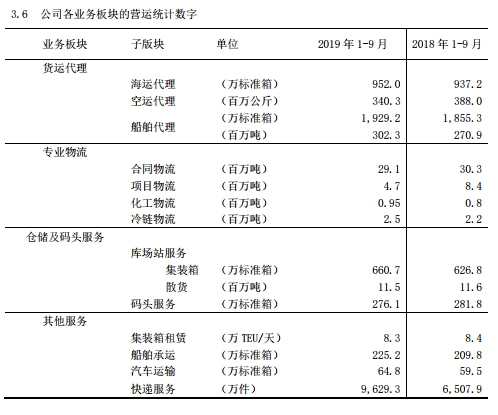 從公司各業(yè)務(wù)板塊運(yùn)營情況來看,2019年1-9月,中國外運(yùn)各版塊業(yè)務(wù)量同比增幅較小,其中不乏較上年同比下降的情況。例如,貨運(yùn)代理中的空運(yùn)代理、專業(yè)物流中的合同物流、項(xiàng)目物流,倉儲及碼頭服務(wù)中的庫場站服務(wù)散貨、碼頭服務(wù)等具體業(yè)務(wù)的貨運(yùn)量較2018年同期相比均有所下降。