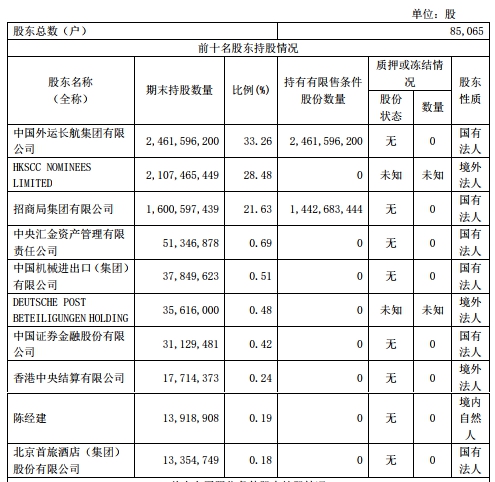 10月30日,中國外運(yùn)發(fā)布第三季度報(bào)告。截至2019年9月30日,中國外運(yùn)前三名股東持股情況為:中國外運(yùn)長航集團(tuán)有限公司持有24.62億股,持股比例33.26%;HKSCC NOMINEES LIMITED持有21.07億股,持股比例28.48%;招商局集團(tuán)持有16.01億股,持股比例21.63%。