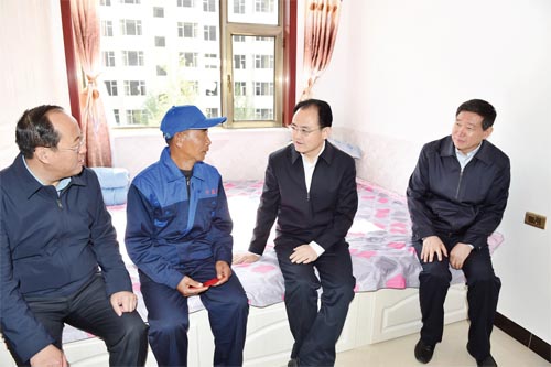 圖為市委書記李俊明在岢嵐縣城扶貧移民集中安置點回訪貧困戶曹六仁。馮曉磊 攝