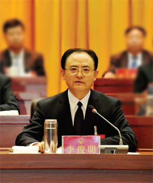 省人大常委會副主任、市委書記李俊明在市四屆人大四次會議閉幕大會上作重要講話。本報記者 劉紀森 攝
