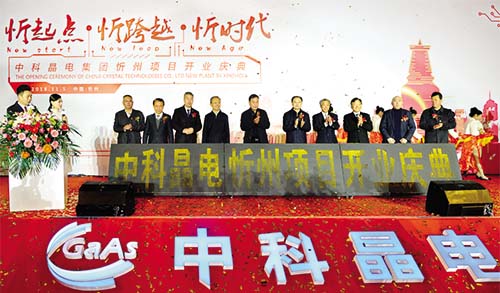 中科晶電忻州項(xiàng)目開(kāi)業(yè)運(yùn)營(yíng)儀式 10、忻州著力打造“中國(guó)第二代半導(dǎo)體芯片之都”,中科晶電忻州半導(dǎo)體產(chǎn)業(yè)基地砷化鎵項(xiàng)目正式開(kāi)業(yè)運(yùn)營(yíng) 11月5日,中科晶電忻州半導(dǎo)體產(chǎn)業(yè)基地砷化鎵項(xiàng)目正式開(kāi)業(yè)運(yùn)營(yíng)。忻州中科晶電信息材料有限公司是在“中國(guó)制造2025”國(guó)家發(fā)展戰(zhàn)略大環(huán)境下,在山西全面深化改革、促進(jìn)資源型地區(qū)轉(zhuǎn)型發(fā)展的大背景下,抓住忻州得天獨(dú)厚的區(qū)位、便利的資源成本和較低的勞動(dòng)用工成本優(yōu)勢(shì),在省市各級(jí)政府的持續(xù)重點(diǎn)關(guān)注和大力支持下設(shè)立的新型半導(dǎo)體材料砷化鎵晶體及晶片制造加工項(xiàng)目。投資2.5億元的項(xiàng)目是以研發(fā)、生產(chǎn)、銷(xiāo)售砷化鎵襯底材料為主,配套建筑面積約1.7萬(wàn)平方米,建設(shè)有2英寸、3英寸、4英寸、6英寸砷化鎵襯底材料大規(guī)模生產(chǎn)線,規(guī)劃年產(chǎn)砷化鎵單晶片折合4英寸200萬(wàn)片。企業(yè)著力推動(dòng)砷化鎵襯底材料產(chǎn)業(yè)化項(xiàng)目成為忻州科技產(chǎn)業(yè)發(fā)展的新動(dòng)力、新引擎、新亮點(diǎn),努力為產(chǎn)業(yè)升級(jí)起到積極的示范作用。