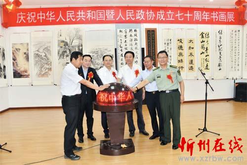 省人大常委會副主任、市委書記李俊明,省政協(xié)副主席席小軍,市人大常委會主任王珍,市政協(xié)主席劉鋼柱,市委常委、宣傳部長陳義青,市委常委、秘書長崔建新,忻州軍分區(qū)司令員李志強(qiáng),忻州師范學(xué)院院長張虎芳,副市長安書田,市政協(xié)副主席王慶榮、高志偉、黃登宇、吳培英,市人大常委會秘書長張?zhí)m軍,市政府秘書長郭寶厚,市政協(xié)秘書長王志剛,已退休的市政協(xié)老領(lǐng)導(dǎo)范懷成、張明成、楊學(xué)書、王志勇等,太原、陽泉、晉中市政協(xié)領(lǐng)導(dǎo)及著名書畫家代表出席開展儀式。忻州籍著名軍旅書畫家郭明高、劉傳光、張全美,國家一級美術(shù)師、中國美術(shù)家協(xié)會會員、廣西桂林的龍山農(nóng)先生等應(yīng)邀出席了開展儀式。劉鋼柱宣布書畫展開展,李俊明、席小軍、郭明高、王珍、劉鋼柱、李志強(qiáng)一起觸動啟動球。王志剛主持開展儀式,高志偉致辭。