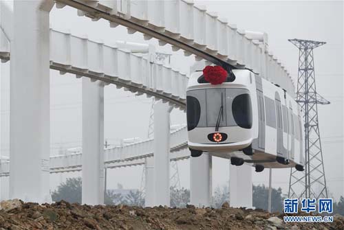 11月21日,在四川成都雙流西南航空港經(jīng)濟開發(fā)區(qū),附近群眾觀看在試驗線上運行的新能源“空鐵”。當日,由中唐空鐵聯(lián)合多家單位研制的新能源懸掛式空中軌道交通試驗線,經(jīng)過近兩個月的試驗與調(diào)試運行,各項指標達到設(shè)計要求。下一步將對新能源“空鐵”進行全面系統(tǒng)的運營測試,進而為制定相關(guān)技術(shù)標準和示范線建設(shè)奠定基礎(chǔ)。新華社記者 江宏景 攝