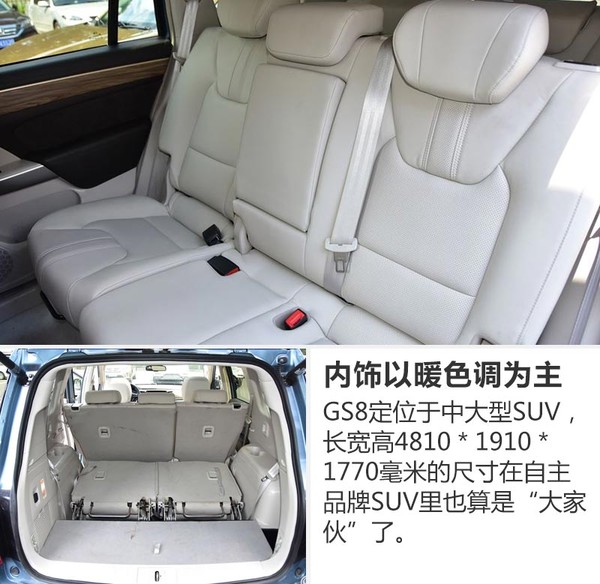 GS8的設(shè)計(jì)由原奔馳設(shè)計(jì)師張帆操刀,在內(nèi)飾部分也較為洞察國(guó)內(nèi)消費(fèi)者的喜好。車內(nèi)整體寬敞舒適,顏色采用偏暖的木色,打造一種家用溫馨感??臻g方面,GS8的長(zhǎng)寬高分別為4810*1910*1770毫米,軸距2800毫米,采用7座布局。
