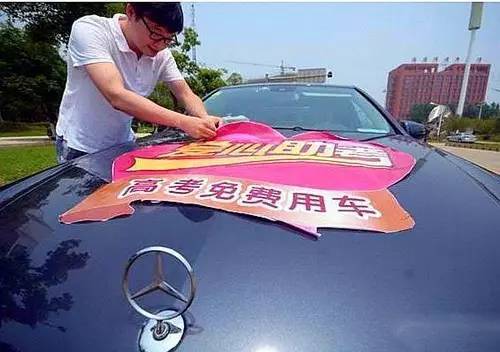瑪莎拉蒂、路虎、奔馳、寶馬……等十輛豪車在路邊一字排開,每輛車的發(fā)動(dòng)機(jī)蓋上都貼著“高考免費(fèi)用車”的標(biāo)語,盡管低調(diào)但車隊(duì)還是吸引了眾人的目光。