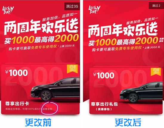 首汽約車App宣傳海報(bào)前后對(duì)比:“返贈(zèng)金額”變成了贈(zèng)送“優(yōu)惠券包”