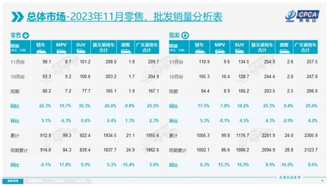 乘聯(lián)會指出,今年11月車市零售環(huán)比小幅走強(qiáng),形成冬季時間升溫的持續(xù)走強(qiáng)態(tài)勢,這也是近幾年的常見走勢,原因是新能源車的增長動力驅(qū)動環(huán)比走強(qiáng)疊加小批量燃油車國六A車型清庫。相較于歷年的年末促銷力度企穩(wěn)收縮的特征,今年11月車市促銷持續(xù)增大,燃油車和新能源車促銷均環(huán)比增大,針對性的增換購促銷和地方補(bǔ)貼,購車消費需求有所釋放。 乘聯(lián)會分析稱,國家層面針對汽車行業(yè)的指引政策頻出,旨在進(jìn)一步穩(wěn)定和擴(kuò)大汽車消費。商務(wù)部推動“百城聯(lián)動”汽車節(jié)和“千縣萬鎮(zhèn)”新能源汽車消費季活動效果顯現(xiàn),多地陸續(xù)發(fā)布新的促消費政策,與企業(yè)促銷合力對年底車市構(gòu)成穩(wěn)定支撐。持續(xù)的降價浪潮使得終端消費者觀望情緒加重,終端促銷邊際效益遞減,“雙11”的市場火爆程度偏弱。 出口方面,今年總體汽車出口延續(xù)去年年末強(qiáng)勢增長特征。11月海關(guān)汽車出口52.4萬輛,同比增長41.6%;1-11月海關(guān)汽車出口476.2萬輛,同比增長59.8%,出口金額927億美元增70.9%。乘聯(lián)會統(tǒng)計口徑下的11月乘用車出口(含整車與CKD)37.8萬輛,同比增長50%,環(huán)比下降3%。1-11月乘用車出口345萬輛,同比增長64%。11月新能源車占出口總量的23.5%。隨著出口運力的提升,11月自主品牌出口達(dá)到33.3萬輛,同比增長75%,環(huán)比增長5%;合資與豪華品牌出口4.5萬輛,同比下降37%。 新能源方面,11月新能源乘用車生產(chǎn)達(dá)到98.9萬輛,同比增長37.3%,環(huán)比增長7.2%。今年以來累計生產(chǎn)783.5萬輛,同比增長32.4%。 11月新能源乘用車批發(fā)銷量達(dá)到96.2萬輛,同比增長31.5%,環(huán)比增長8.2%;今年以來累計批發(fā)777.7萬輛,同比增長35.2%。11月新能源車市場零售84.1萬輛,同比增長39.8%,環(huán)比增長8.9%;今年以來累計零售680.9萬輛,同比增長35.2%。 對于后期車市,乘聯(lián)會表示,今年12月是小月,元旦休假有兩天在12月。12月有21個工作日,相對2022年12月的22個工作日少一天,加之年末最后兩天休假,預(yù)計今年部分年銷量將結(jié)轉(zhuǎn)到明年,這必將對2024年的開門紅有很好的支撐效果,也有利于明年經(jīng)濟(jì)增長。 新能源車方面,乘聯(lián)會認(rèn)為,2024年新能源車的市場增長預(yù)計相對樂觀:新能源乘用車批發(fā)預(yù)計達(dá)到1100萬輛,凈增量230萬輛,同比增長22%,滲透率達(dá)到40%,新能源乘用車保持較強(qiáng)增長勢頭。(中新經(jīng)緯APP) (責(zé)任編輯:蔡文斌) |