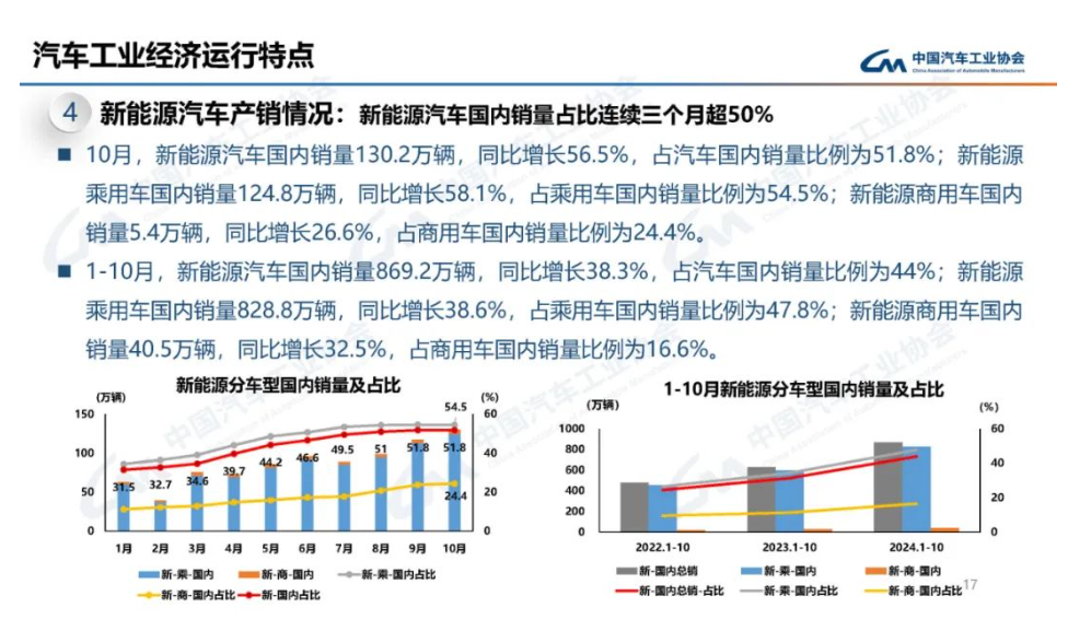 在新能源汽車方面,10 月,新能源汽車產(chǎn)銷分別完成 146.3 萬輛和 143 萬輛,同比分別增長 48% 和 49.6%,新能源汽車新車銷量占汽車新車總銷量的 46.8%。1-10 月,新能源汽車產(chǎn)銷分別完成 977.9 萬輛和 975 萬輛,同比分別增長 33% 和 33.9%,新能源汽車新車銷量達到汽車新車總銷量的 39.6%。
