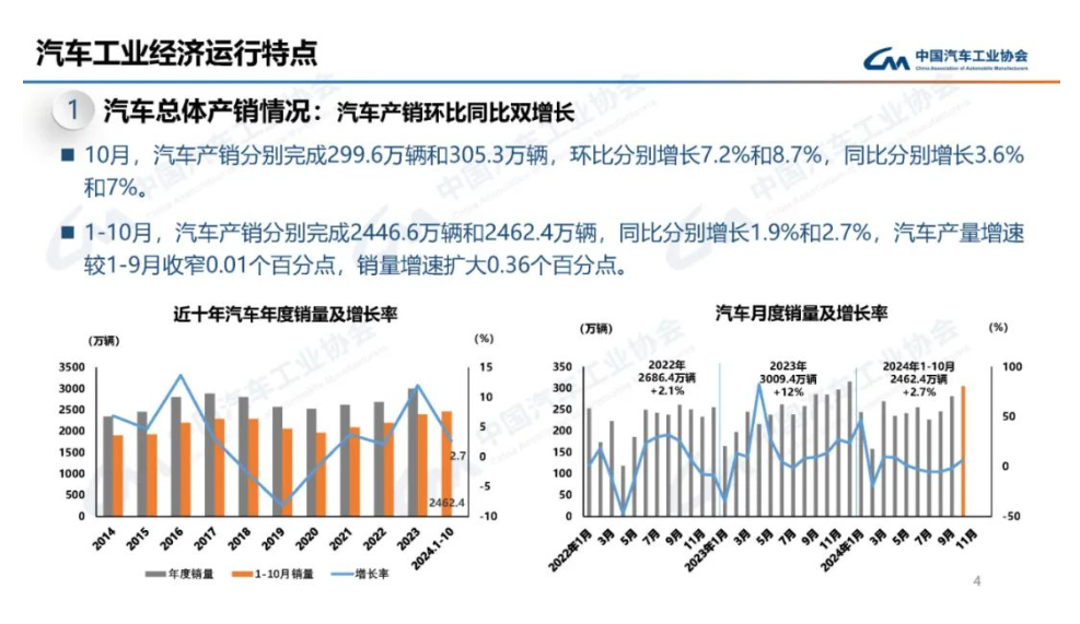 中汽協(xié)發(fā)布數(shù)據(jù)顯示,10月,汽車產(chǎn)銷分別完成299.6萬輛和305.3萬輛,環(huán)比分別增長7.2%和8.7%,同比分別增長3.6%和7%。1-10月,汽車產(chǎn)銷分別完成2446.6萬輛和2462.4萬輛,同比分別增長1.9%和2.7%,汽車產(chǎn)量增速較1-9月收窄0.01個百分點,銷量增速擴大0.36個百分點。