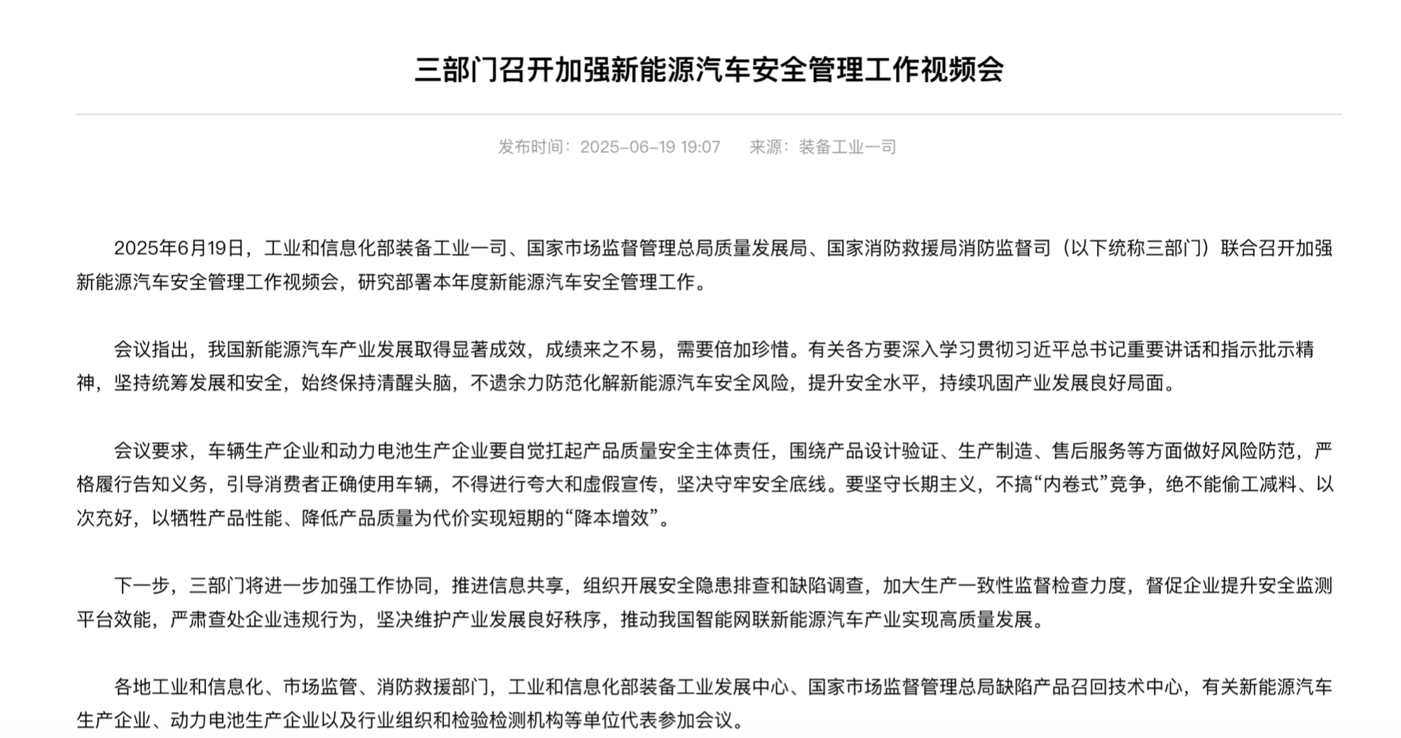 此前(6月9日),工信部已啟動(dòng)道路機(jī)動(dòng)車輛生產(chǎn)企業(yè)及產(chǎn)品生產(chǎn)一致性監(jiān)督檢查工作,此次三部門聯(lián)合行動(dòng)進(jìn)一步加碼新能源生產(chǎn)安全與質(zhì)量管理。