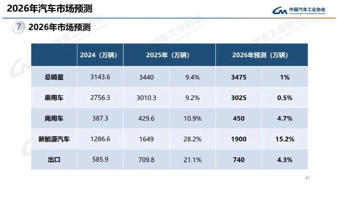 與此同時,中汽協(xié)對2026年汽車市場進行了預(yù)測。2026年,預(yù)計國產(chǎn)汽車總銷量將達到3475萬輛,微增1%。其中,乘用車預(yù)計為3025萬輛,微增0.5%;商用車預(yù)計為450萬輛,小幅增長4.7%;新能源汽車預(yù)計為1900萬輛,增長15.2%;汽車出口量預(yù)計為740萬輛,小幅增長4.3%。
