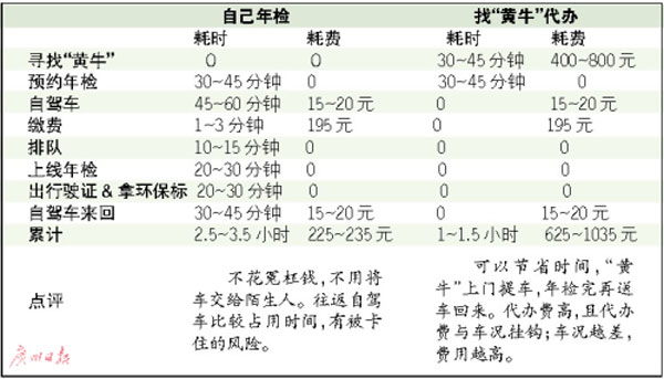 “老車”上線年檢,自己辦與找“黃?!贝k,各自需要占用多少時(shí)間和多少支出?給“黃牛”的冤枉錢,可不可以省下?