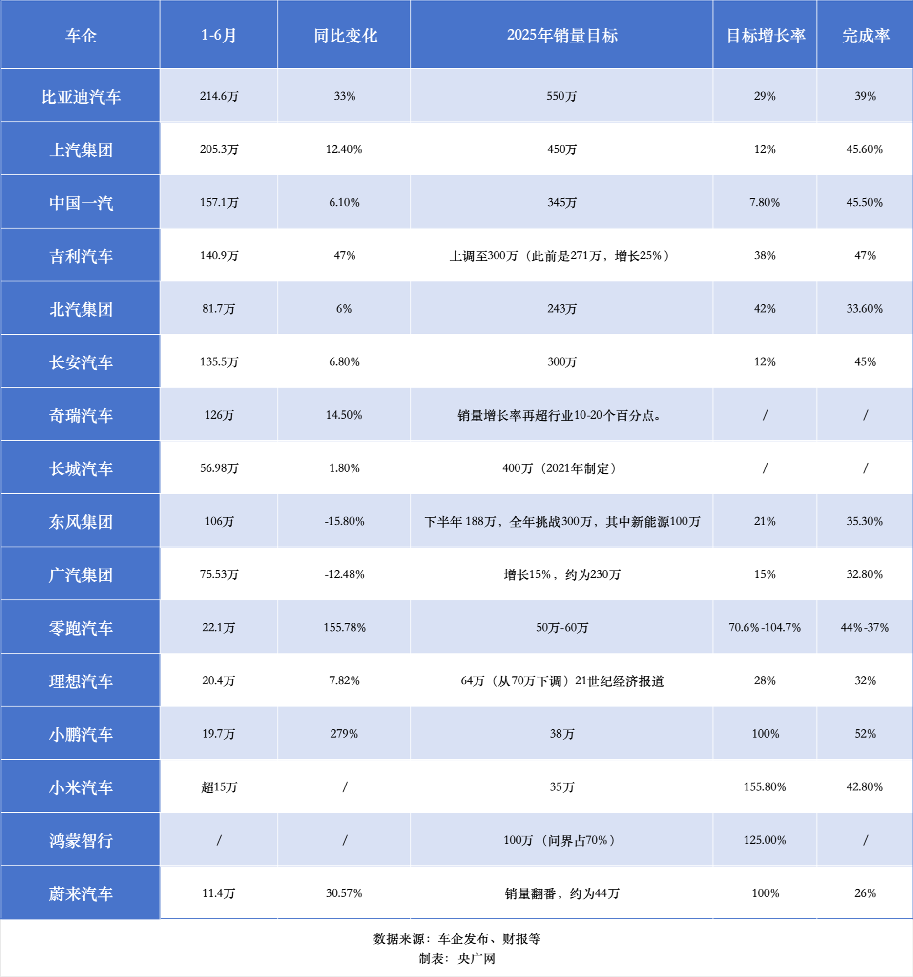 央廣網(wǎng)統(tǒng)計(jì)的各大汽車集團(tuán)、車企公布的銷量數(shù)據(jù),目前,蔚來汽車的目標(biāo)完成率低于30%,比亞迪汽車、北汽集團(tuán)、東風(fēng)集團(tuán)、廣汽集團(tuán)、理想汽車5家車企的目標(biāo)完成率在30%-40%之間,上汽集團(tuán)、中國一汽、吉利集團(tuán)、長安汽車、零跑汽車、小鵬汽車、小米汽車7家車企的完成率超過40%。此外,奇瑞集團(tuán)、長城汽車、鴻蒙智行等因數(shù)據(jù)不完善此次不計(jì)入統(tǒng)計(jì)。
