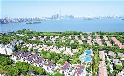 江蘇省蘇州市近年持續(xù)推動生態(tài)文明建設,有效改善城區(qū)河湖水質(zhì),構(gòu)建綠色生態(tài)宜居城市。圖為坐落在蘇州市金雞湖畔的居民住宅區(qū)。華雪根攝(人民視覺)