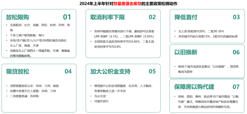 (圖源:克而瑞研究中心,統(tǒng)計(jì)截止時(shí)間:2024年6月24日) 在中央政策的支持下,已有越來(lái)越多的城市鼓勵(lì)國(guó)有企業(yè)進(jìn)場(chǎng),收購(gòu)二手舊房用于保障房或者市場(chǎng)化租賃用途,部分城市已有落地的方案,如安徽宣城城市建設(shè)集團(tuán)發(fā)布商品房以舊換新公告;武漢硚口城市更新公司深度參與,購(gòu)房者舊房由區(qū)國(guó)企進(jìn)行收購(gòu),試點(diǎn)“以房換房”;南京市安居建設(shè)集團(tuán)啟動(dòng)主城六區(qū)存量住房“以舊換新”試點(diǎn)…… 同時(shí),還有部分城市,鼓勵(lì)非國(guó)企收購(gòu)換房人的舊房,拓寬新業(yè)態(tài)、發(fā)展新業(yè)務(wù)。一系列相關(guān)配套政策正在加速落地,這不僅有利于緩解企業(yè)資金壓力,同時(shí)也有助于加快商品房市場(chǎng)去庫(kù)存及增加保障房供給。 展望:下半年政策將繼續(xù)以穩(wěn)定市場(chǎng)和去庫(kù)存為主要目標(biāo) 業(yè)內(nèi)人士普遍認(rèn)為,2024年上半年多項(xiàng)樓市政策已陸續(xù)出臺(tái),體現(xiàn)了政府對(duì)房地產(chǎn)市場(chǎng)穩(wěn)定性的高度重視。通過一系列政策組合拳,平衡了市場(chǎng)供需,短期內(nèi)核心城市居民購(gòu)房信心有所修復(fù)。對(duì)于下半年,受訪機(jī)構(gòu)和業(yè)內(nèi)人士都表達(dá)了相對(duì)樂觀的看法。 58安居客研究院認(rèn)為,下半年政策將繼續(xù)以穩(wěn)定市場(chǎng)和去庫(kù)存為主要目標(biāo),預(yù)計(jì)政府將繼續(xù)出臺(tái)力度更大的支持政策,并形成“多子聯(lián)動(dòng)”:一是增加改善型購(gòu)房者入場(chǎng)。在“以舊換新”上加大覆蓋面和政府資金的投入,同時(shí)更多城市將取消限售,以加速二手房到新房之間的流轉(zhuǎn);在支持改善型購(gòu)房方面,還將在放寬第三套貸款上下足功夫。 二是去化已建未售項(xiàng)目。國(guó)企“收儲(chǔ)”已建未售新房用作保障性住房,且將逐步擴(kuò)大實(shí)施范圍,促進(jìn)房企將回籠資金迅速投入在建工程,以順利“保交付”。 三是土地增量少而精,推高質(zhì)量土地。供地節(jié)奏將進(jìn)一步趨緩,同時(shí)高質(zhì)量或者核心區(qū)地塊的比重將大幅增加。 對(duì)于市場(chǎng)方面的預(yù)測(cè),中指研究院分析師孟新增表示,下半年,一線城市在政策優(yōu)化帶動(dòng)下,新房成交規(guī)模有望溫和修復(fù);二線、三四線城市低基數(shù)效應(yīng)明顯減弱,新房成交面積同比降幅或?qū)⒚黠@收窄。 在孟新增看來(lái),一線城市政策仍具備較大優(yōu)化空間,隨著下半年政策端持續(xù)發(fā)力,一線城市市場(chǎng)情緒有望繼續(xù)好轉(zhuǎn),從而帶動(dòng)新房成交規(guī)模溫和修復(fù);二線及三四線城市政策優(yōu)化空間不足,市場(chǎng)情緒整體或難有明顯改觀,市場(chǎng)活躍度預(yù)計(jì)將保持在低位,但隨著下半年高基數(shù)效應(yīng)的明顯減弱,新房成交面積同比降幅或出現(xiàn)大幅收窄,其中部分核心城市下半年市場(chǎng)有望逐漸筑底企穩(wěn)。 孟新增指出,目前,政府收儲(chǔ)未售新房、國(guó)企收舊換新等模式才剛剛開始,未來(lái)隨著各城市大面積推廣以及配套資金的落地落實(shí),預(yù)計(jì)將對(duì)去化庫(kù)存、穩(wěn)定市場(chǎng)起到積極作用,這都將有利于加快房地產(chǎn)市場(chǎng)的企穩(wěn)恢復(fù)。 (責(zé)任編輯:蔡文斌) |