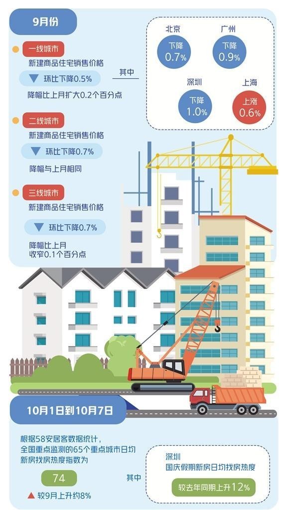 9月26日,中央政治局會議定調“要促進房地產市場止跌回穩(wěn)”,釋放出“穩(wěn)地產”信號。隨后,一線城市集中優(yōu)化樓市政策,廣州全面取消限購,北京、上海、深圳優(yōu)化限購、限貸政策,北京、上海明確將及時取消普宅認定標準,深圳取消限售,上海、深圳增值稅免征年限“5改2”,帶動國慶假期樓市熱度顯著提升。