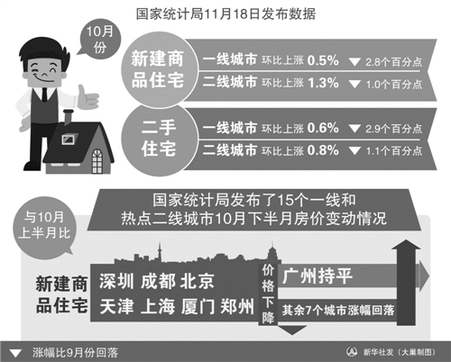 國(guó)家統(tǒng)計(jì)局城市司高級(jí)統(tǒng)計(jì)師劉建偉介紹,與10月份上半月比,10月份下半月新建商品住宅價(jià)格除深圳和成都2個(gè)城市繼續(xù)下降外,北京、天津、上海、廈門和鄭州等5個(gè)城市也由升轉(zhuǎn)降,降幅在0.1至0.4個(gè)百分點(diǎn)之間;其余7個(gè)城市新建商品住宅價(jià)格環(huán)比漲幅進(jìn)一步回落,回落幅度在0.4至3.3個(gè)百分點(diǎn)之間。