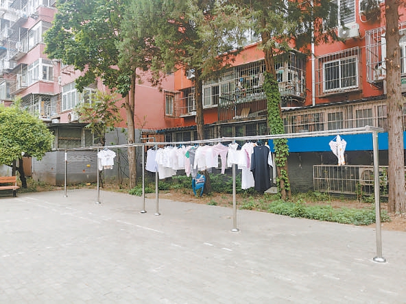 走出古城南路社區(qū)東門,沿古城東街北行400余米右轉(zhuǎn)進(jìn)入八角北路社區(qū),只見幾株高大的國槐及道邊的綠藤錯(cuò)落有致。再向里走,是一塊寬闊的活動(dòng)場(chǎng)地,北側(cè)建有一排不銹鋼晾衣架,架上晾滿了衣服?!坝芯用裉岢黾依镪柵_(tái)上晾衣服不方便,我們特地尋找合適地方,為這些社區(qū)建了晾衣架。”北京石房物業(yè)有限公司(以下簡(jiǎn)稱石房物業(yè))副經(jīng)理孫偉說。