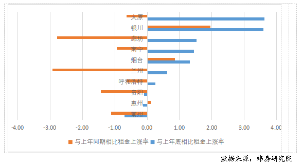 三線城市上半年住房租金總體上漲,但大部分仍低于去年同期水平。住房大數(shù)據(jù)監(jiān)測的重點(diǎn)40城中有10個三線城市。與上年末相比,其中7個城市上半年住房租金上漲,3個城市下降。其中,太原和銀川漲幅最高,分別為3.63%和3.60%。與去年同期相比,7個城市住房租金低于去年同期水平,而3個城市住房租金高于去年同期水平。其中,蘭州和廊坊住房租金跌幅最高,分別為2.93%和2.78%。