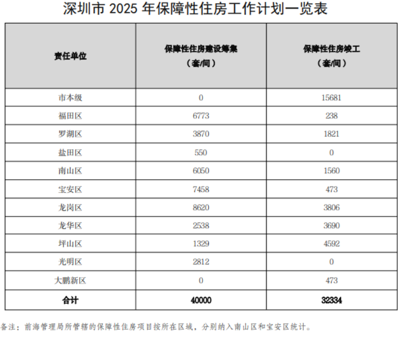 2025年,深圳計劃新安排建設籌集保障性住房4萬套(間),計劃竣工保障性住房3.23萬套(間)。