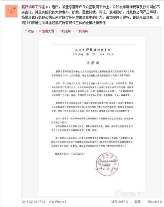 2月28日晚,“楊冪工作室官方微博”發(fā)表律師函,對近日惡意誹謗楊冪的不實言論進(jìn)行否認(rèn),稱:“近日,某些惡意賬戶在眾互聯(lián)網(wǎng)平臺上,公然發(fā)布誹謗楊冪及我公司的不實言論,并且有組織的大肆發(fā)布、擴(kuò)散,惡意轉(zhuǎn)載、評論,混淆視聽。對此我公司嚴(yán)正聲明:楊冪及嘉行影視公司從未實施過任何虛假信息中的行為。請立即停止侵權(quán),刪除全部信息,否則我們將通過法律途徑追究所有侵權(quán)主體的全部法律責(zé)任?!?/p>