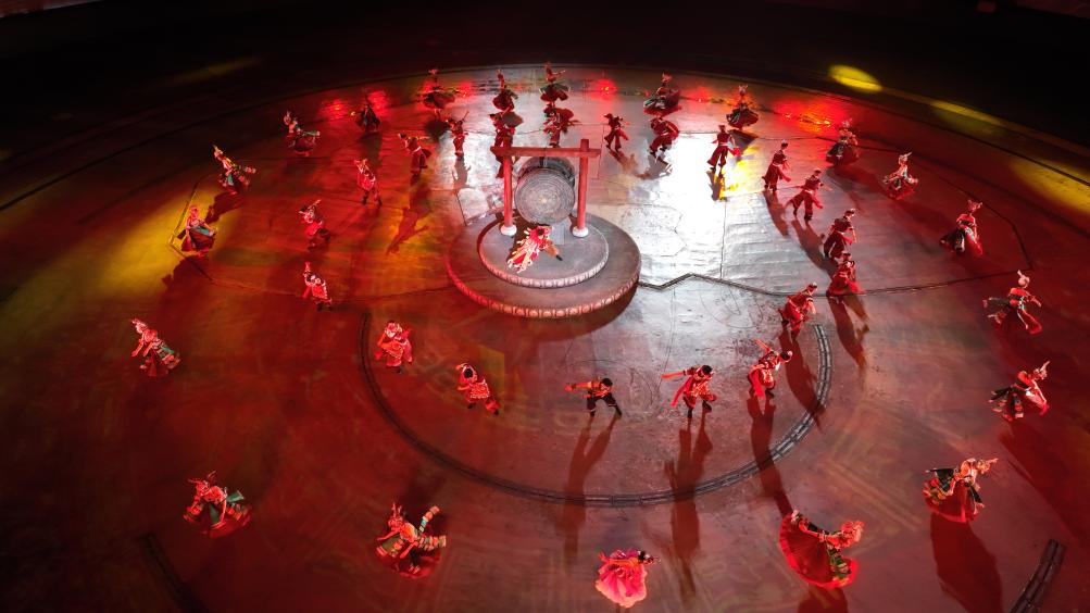 9月20日晚,演員在貴州省雷山縣大塘鎮(zhèn)表演苗族歌舞詩劇《仰歐?!罚o人機照片)。新華社記者 楊文斌 攝