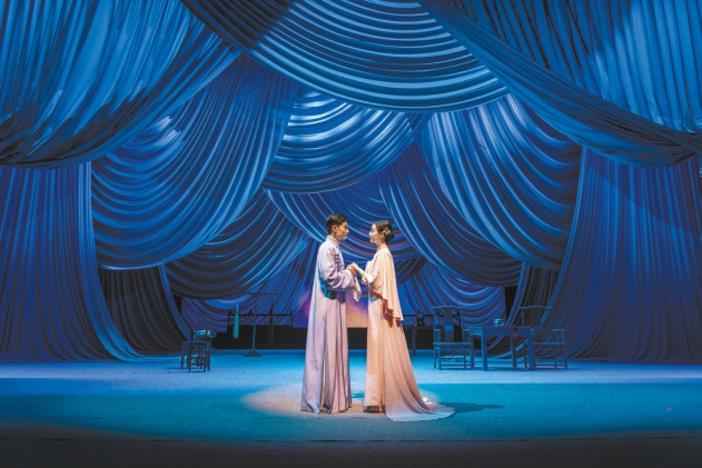 近日,北京人民藝術(shù)劇院再次排演該劇,以意象化手段賦予劇中男女主人公的愛(ài)情以詩(shī)意——不但在兩人交談時(shí)加入了許多戲曲身段,更加入了新的臺(tái)詞強(qiáng)化兩人的愛(ài)慕之情;結(jié)尾以一段雙人舞展現(xiàn)兩個(gè)自由的靈魂在虛空中的相會(huì);不時(shí)出現(xiàn)的昆曲《牡丹亭》作為背景音樂(lè),昭示兩人超越生死的愛(ài)戀。
