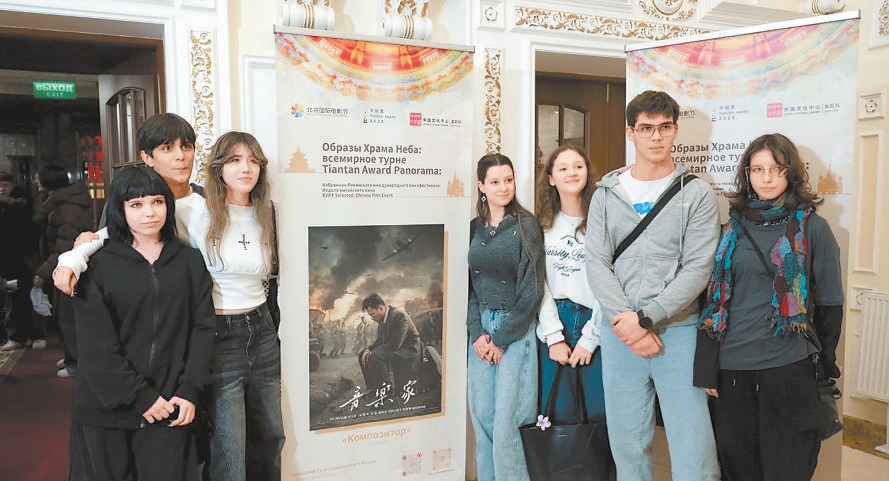 俄羅斯觀眾熱情參加北京電影“走出去”交流活動(dòng),與喜愛(ài)的電影海報(bào)合影。