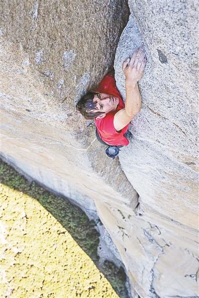 在亞歷克斯之前,從未有人以無保護(hù)的方式登頂過酋長巖。位于美國加州優(yōu)勝美地國家公園的酋長巖,是全球攀登界最有影響力的巨石,這塊花崗巖大石,從平地驀地拔起睥睨群倫,最高的垂直落差超過3000英尺(900余米),被稱為“攀巖宇宙中心”,是世界上最難完成的攀巖之一。一般攀巖高手在有保護(hù)的情況下會花三到五天的時(shí)間才能攀爬上去。但是,在2017年6月3日,亞歷克斯在沒有繩索、安全帶及其他防護(hù)設(shè)備的情況下,僅憑一小袋石灰粉,憑借著雙手雙腳,花了3小時(shí)56分鐘就成功登頂,亞歷克斯的這一壯舉被稱為是“無保護(hù)攀登界的成功登月”、“體育界最偉大的成就之一”。