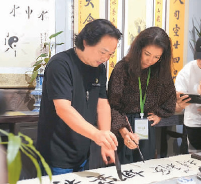 巴西泰坦尼制作有限公司制作人莉莉安娜·羅查·卡瓦薩(右)在廣東珠海北山社區(qū)體驗(yàn)書法。論壇主辦方供圖