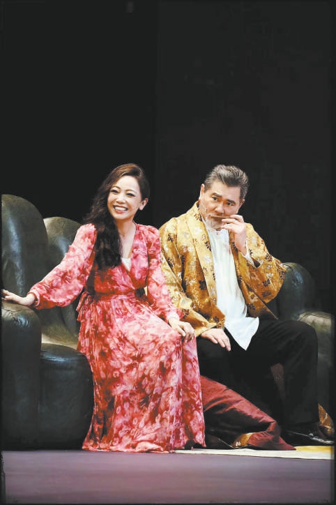 打磨人物,不僅要貼近人物的內(nèi)心,還要轉(zhuǎn)化生成一套獨(dú)特的表演語法,才能引發(fā)觀眾的震顫。《鱷魚》中的人物設(shè)計相當(dāng)現(xiàn)代。角色固然有其姓名,但在稱呼上卻體現(xiàn)為復(fù)雜身份的交替,例如單無憚:一會兒是落馬失勢、人人喊打的“市長”,一會兒是家中掌權(quán)、威風(fēng)凜凜的“老爺”,一會兒又是唯利是圖、眾叛親離的“舅舅”,如此微妙的心態(tài)變化,皆要演員下足功夫,琢磨人物的一舉一動。趙文瑄與鄧萃雯兩位演員,在人物口音塑造上花了不少心思。趙文瑄談吐論說時,既要保留那種拿腔作勢,又要有自詡為詩人的韻律感,所以必須格外注重每一句話的重音位置,才能使臺詞成為動作性的表達(dá)。鄧萃雯的“港普”暗示了人物復(fù)雜的身份經(jīng)歷,為了表現(xiàn)出瘦馬這一“情婦”角色獨(dú)有的悲涼感,她在形體表現(xiàn)上的婀娜多姿、風(fēng)情萬種,也與語言上的牙尖嘴利、咄咄逼人形成反差,展現(xiàn)出了人物可氣與可悲的矛盾處境。