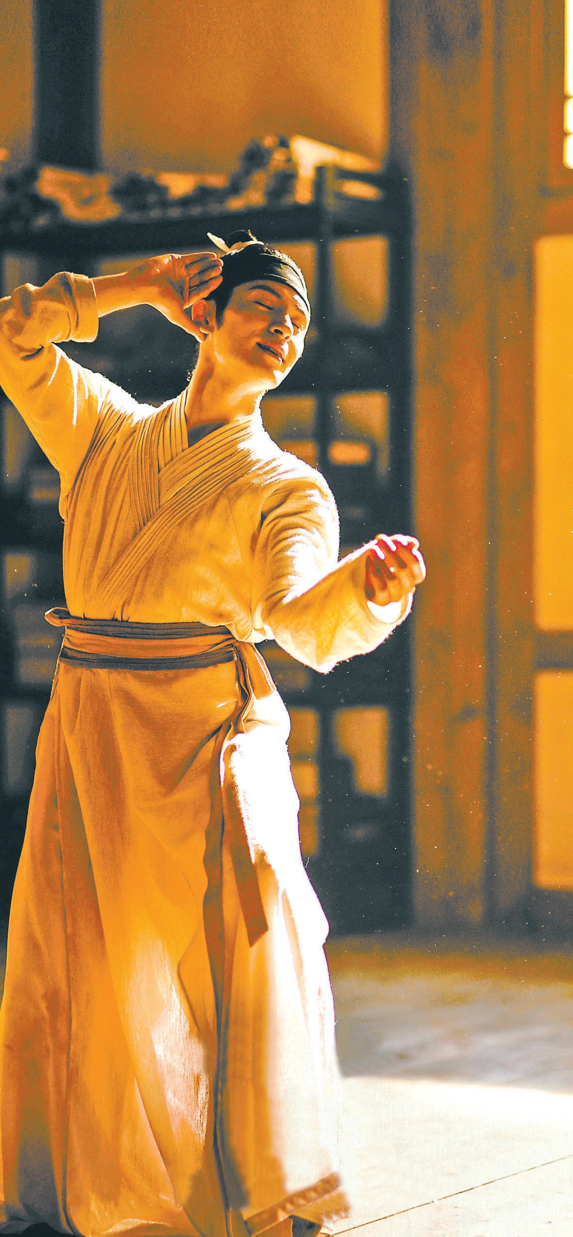 美術(shù)方面,電影用特效配合實(shí)景來(lái)中和舞劇的“大寫意”,將舞臺(tái)上需要演員和觀眾共同想象的部分用具體的畫(huà)面呈現(xiàn)出來(lái),比如磨石人(劉洋飾)在峭壁尋石的驚險(xiǎn),制筆人(王晶飾)在茅屋工作時(shí)的專注,制墨人(戴可偉等飾)淬墨時(shí)揮汗如雨的景象……畫(huà)面中諸多細(xì)微之處讓《千里江山圖》背后的時(shí)代更加真實(shí)可感,這是與觀眾對(duì)望時(shí)的一眼千年。