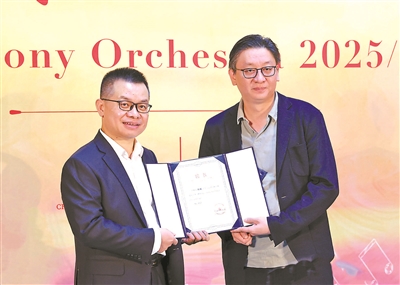 中國交響樂團(tuán)黨委書記周宇(左)為著名小提琴家陸威頒發(fā)客座首席聘書。攝影/羅維