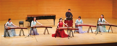 壓軸登場的古箏協(xié)奏曲《紫禁·瑤光》堪稱本場演出視聽亮點。吉煒領(lǐng)奏的團隊以傳統(tǒng)箏搭配七聲弦制古箏及復原古樂器筑、軋箏,在王梓碩的打擊樂配合下,既展現(xiàn)宮廷音樂的風雅,又以“玉之光采”頌揚君子品格,古樸與創(chuàng)新的融合贏得全場持久掌聲。