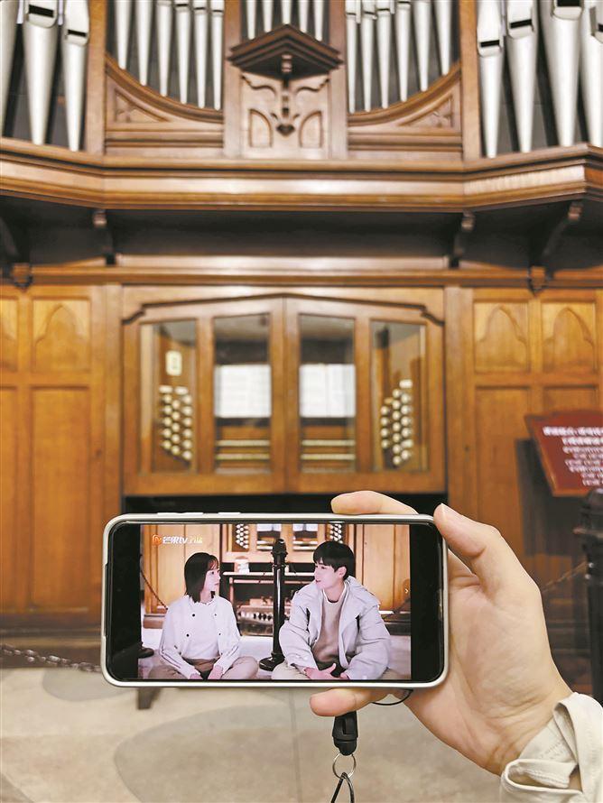 來(lái)鼓浪嶼打卡的游客將劇照和現(xiàn)場(chǎng)對(duì)比,拍照留念。