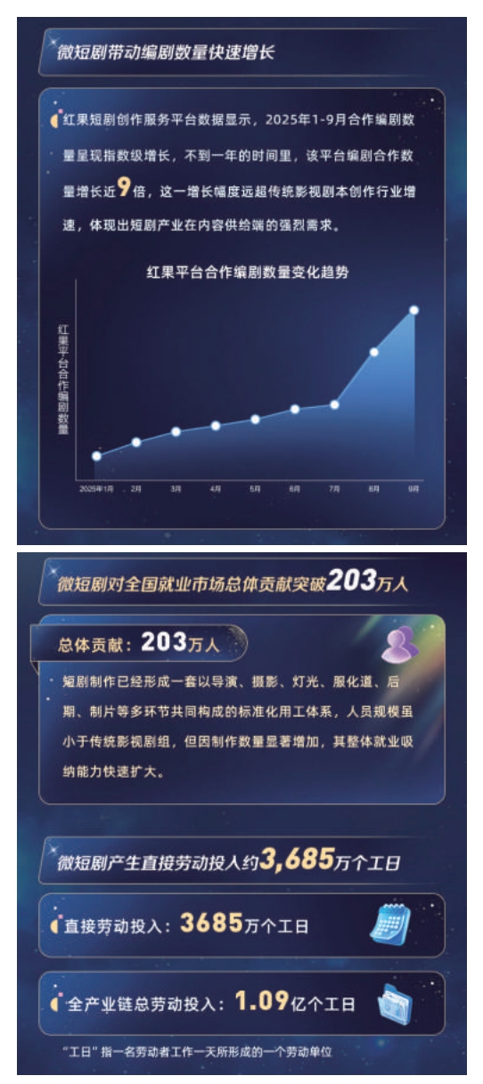 這不僅大幅提升了人力資源的利用效率,也為從業(yè)人員帶來了長期且穩(wěn)定的工作預(yù)期,吸引了大量人才涌入。以編劇為例,紅果短劇創(chuàng)作服務(wù)平臺數(shù)據(jù)顯示,2025年1-9月合作編劇數(shù)量呈現(xiàn)指數(shù)級增長,不到一年的時間里,平臺編劇合作數(shù)量增長近9倍,遠超傳統(tǒng)影視劇本創(chuàng)作行業(yè)增速。