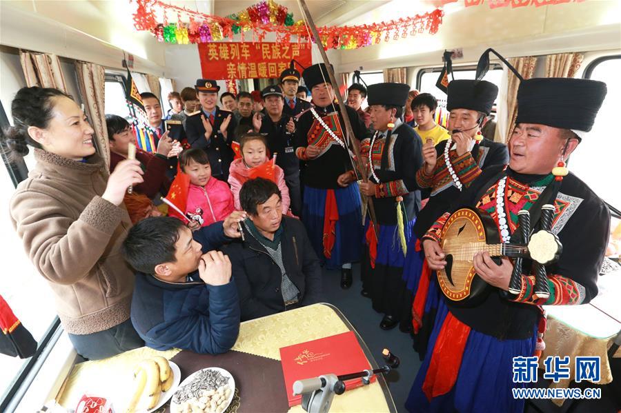 2月1日,彝族藝術(shù)家在K165次列車上為旅客表演。當(dāng)日,在西安鐵路局西安至昆明的K165次列車上,四川美姑縣原生態(tài)畢摩樂隊(duì)與西安客運(yùn)段職工民樂小分隊(duì)聯(lián)合舉辦“英雄列車民族之聲親情溫暖回家路”音樂會(huì),畢摩樂隊(duì)用口弦、哈門、木葉、瑪布等彝族民間樂器演奏的音樂為返鄉(xiāng)過年的旅客提前送上新年祝福。民間藝術(shù)家和列車乘務(wù)員還為旅客們送上“?!弊?、春聯(lián)。新華社發(fā)