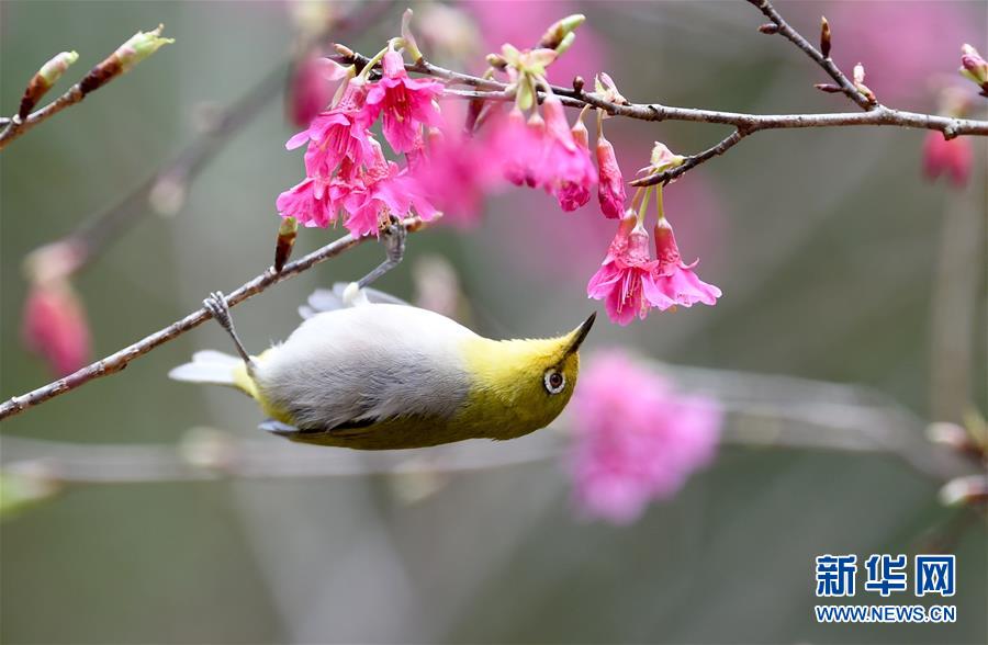 2月18日,一只綠翅短腳鵯鳥在福州森林公園櫻花園采食花蜜。隨著天氣轉(zhuǎn)暖,福州國家森林公園的2.5公頃櫻花園內(nèi)櫻花盛開,引得眾多鳥兒前來采食花蜜,春色盎然。 新華社記者 姜克紅 攝