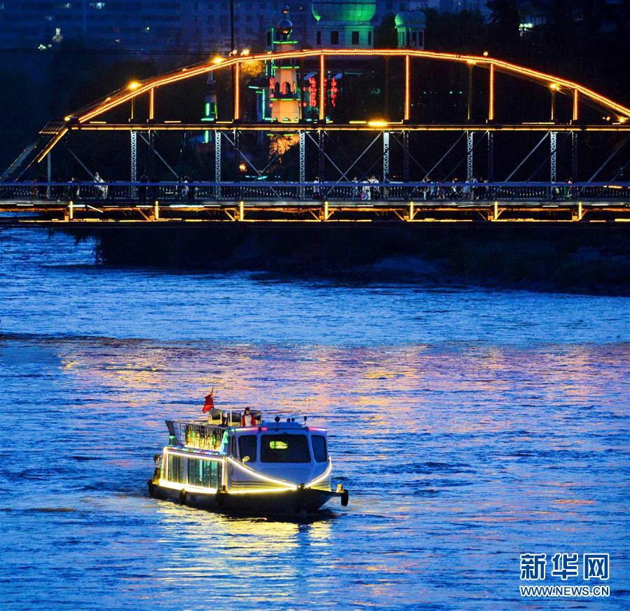 6月14日,一艘游輪從黃河蘭州段中山橋下穿過。自6月12日起,蘭州黃河游輪夏季夜航航線正式開通。據(jù)了解,作為黃河蘭州段水上旅游重點(diǎn)線路,該航線由蘭州市城關(guān)區(qū)蘭州港碼頭和白塔山碼頭始發(fā),每晚20時(shí)起開行,全程約6公里,運(yùn)行時(shí)長(zhǎng)50分鐘左右。游客可以乘坐豪華游輪欣賞黃河夜景,感受蘭州黃河風(fēng)情線別樣魅力。新華社記者 陳斌 攝