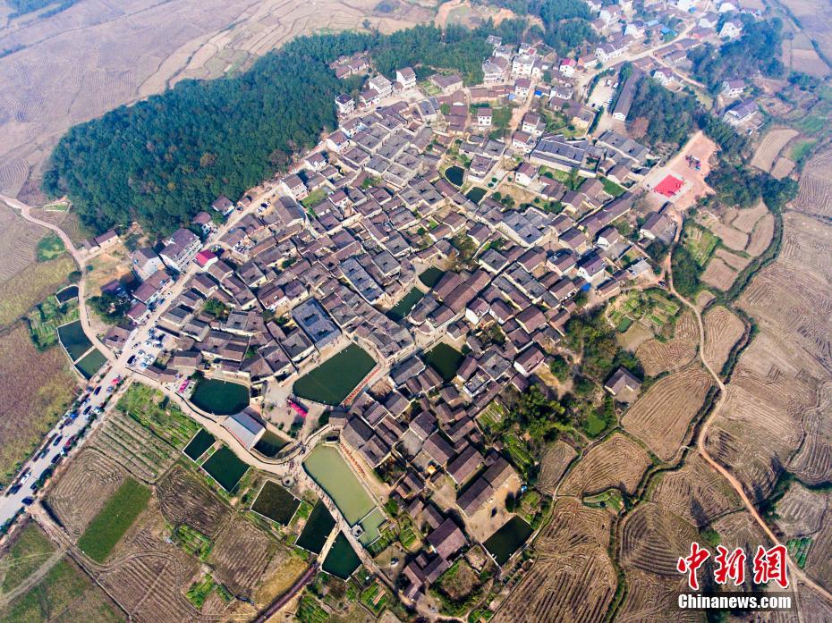 12月10日,航拍位于江西金溪縣有著600多年歷史的中國歷史文化名村、中國傳統(tǒng)村落竹橋古村,俯瞰全村,形似一柄巨扇。該村現(xiàn)保存有明代所建民居8幢,明代祠堂1幢,其余為清代建筑,青磚灰瓦,樸實素雅,為贛派建筑最典型的代表。村前溪水長流,良田萬頃,村后茂林修竹,鳥鳴樹幽,身歷其境,如入畫中。傅建斌 攝