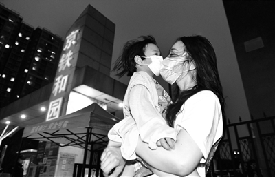 昨晚8點(diǎn)剛過,京鐵和園小區(qū)已有居民走出小區(qū),前往附近的超市、公園。在小區(qū)門口,3歲的多多老遠(yuǎn)就看到門外的媽媽,高興壞了。多多的媽媽告訴北青報記者,孩子一直住在京鐵和園的奶奶家,社區(qū)封閉后,她只能晚上隔著大門看看孩子。聽說昨晚社區(qū)解除封閉,她特意趕過來想抱一抱多多。不過,由于多多和奶奶的出入證正在辦理中,孩子還不能走出小區(qū)。在征得門口值守人員的同意后,多多跟媽媽終于在小區(qū)外重逢,母子倆擁抱在一起。