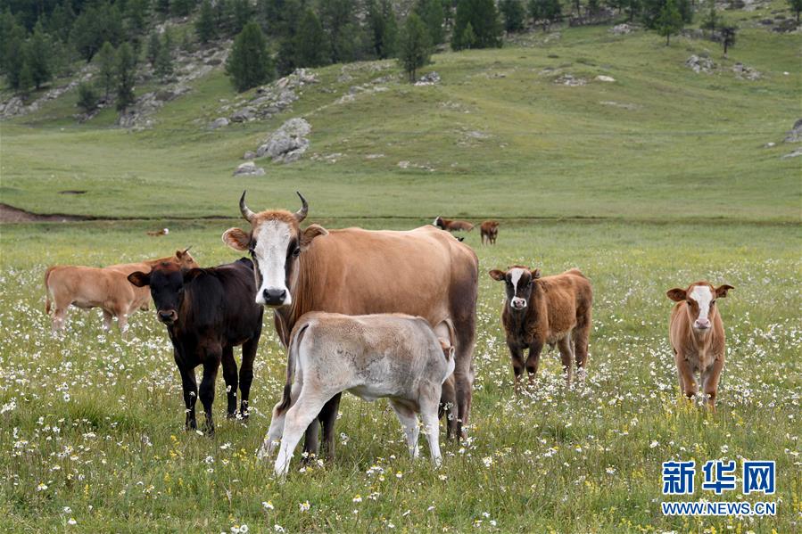 這是6月21日拍攝的新疆阿勒泰地區(qū)哈巴河縣的牧場(chǎng)風(fēng)光。新華社記者 沙達(dá)提 攝
